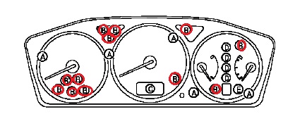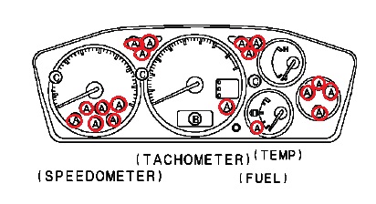 Лампочка указателя поворотов, индикатора уровня топлива, индикатора топлива, температуры охлаждающей жидкости, включения передних и задних противотуманных фар, стояночный тормоз, ближний и дальний свет, "Check Engine" на ПАНЕЛИ ПРИБОРОВ